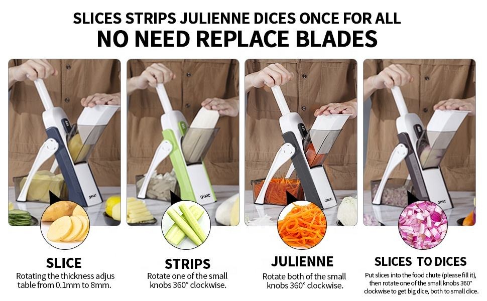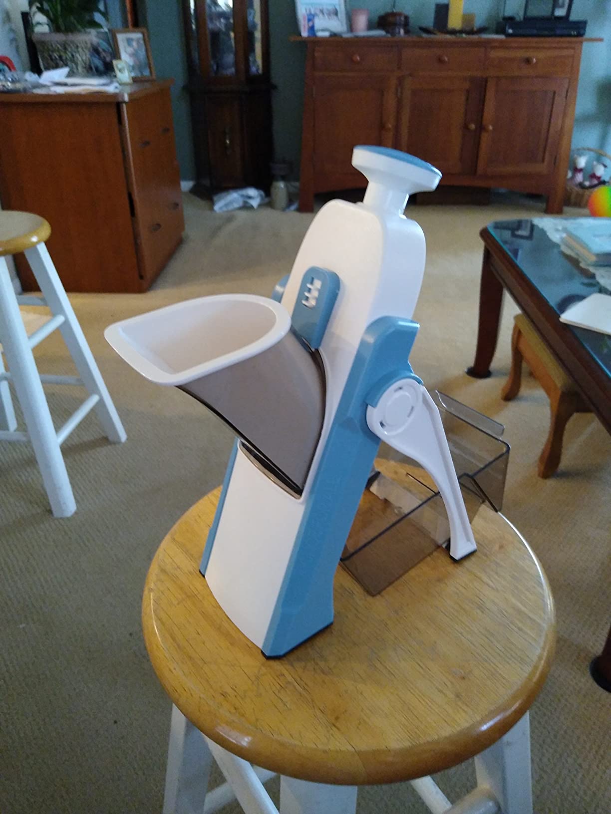 It is easy to select cuts, slice, dice etc. No extra blades, compact for storage, greater diversity of cuts than the Pampered Chef mandolins and most of all, SAFER.So good I purchased and shipped one to all family members who have expressed their like for it.